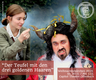 Die Zuschauer erleben die spannende Geschichte des Glückskindes Klara (Laura Vogel), sie macht sich auf die Reise zum „Teufel mit den drei goldenen Haaren“. Eine List der bösen Königin (Nadine Graf) führt sie weg von ihrem beschaulichen Leben an der Mühle bei Mama und Papa und sie begibt sich auf die gefährliche Reise. Doch Klara kann sich buchstäblich auf ihr Glück verlassen. So begegnet sie einer singenden Räuberbande im Wald, die es gut mit ihr meint und ihr wieder auf den rechten Weg hilft. Sie muss spannende Rätsel lösen und begegnet schließlich in der Hölle dem Teufel Luzifer (Thomas Isser) und versucht mit Hilfe seiner Großmutter (Gabi Thomas) ihm die drei goldenen Haare abzunehmen. Ob es ihr gelingt? Und ob Klara ihren geliebten Prinzen (Johannes Büttner) kriegt? Das erfahren die Zuschauerinnen und Zuschauer beim diesjährigen Weihnachtsmärchen im Capitol Theater Offenbach.